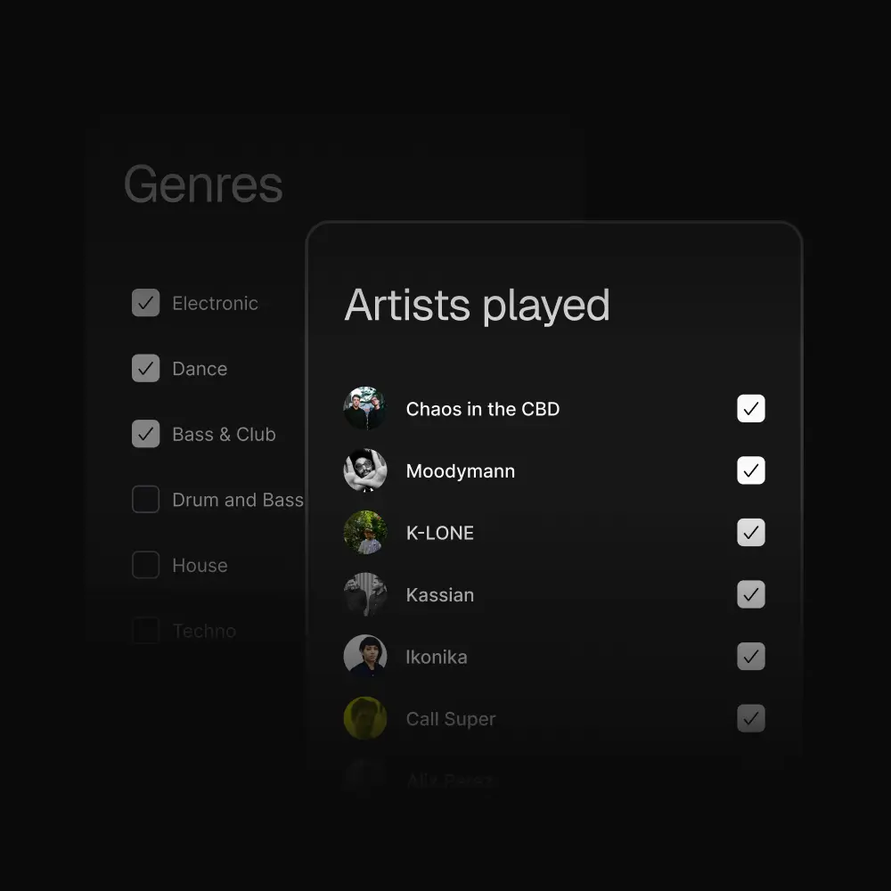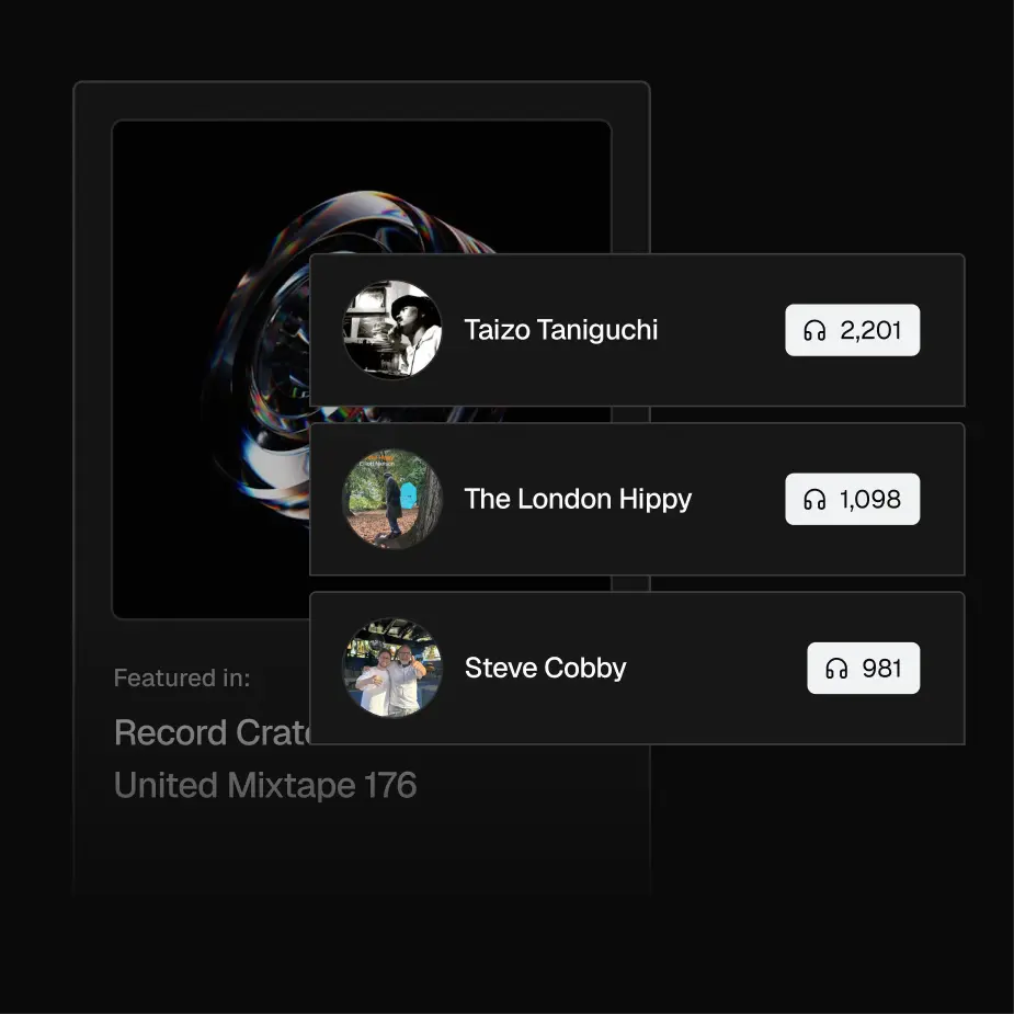You can see who received, opened, clicked, listened to, and downloaded your promo in a real-time dashboard. We are also building audio fingerprinting into Trackdrop, powered by Mixcloud’s listening infrastructure. This will surface when your tracks are played in DJ sets and mixes after they leave your inbox. This is designed to give you clearer insight into real-world reach and downstream exposure, not just inbox activity.