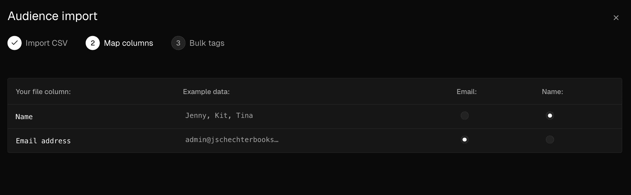Trackdrop will try to detect the right columns based on the header names in your CSV file. If the Email or Name don't map automatically, you can select them manually using the radio buttons on the Map columns step.