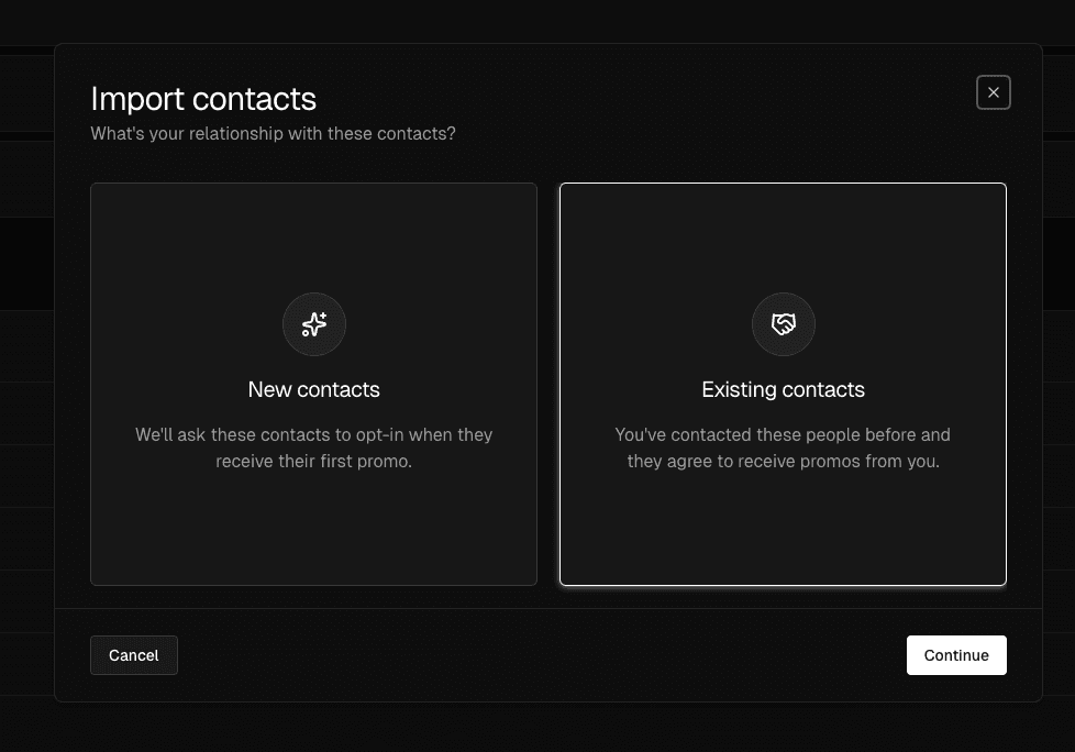 If your contacts had already opted in to receive promos from you on Inflyte, tick ‘These contacts already opted in on another platform’, then click Continue. This marks them as subscribed straight away, so they won't be asked to opt in again when they receive their first promo from you.