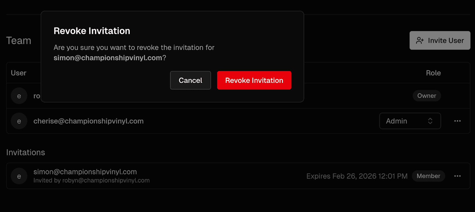 This will void the link in the invitation email that was sent to this address. The recipient will no longer be able to join unless you choose to send them a new link by clicking Invite User.