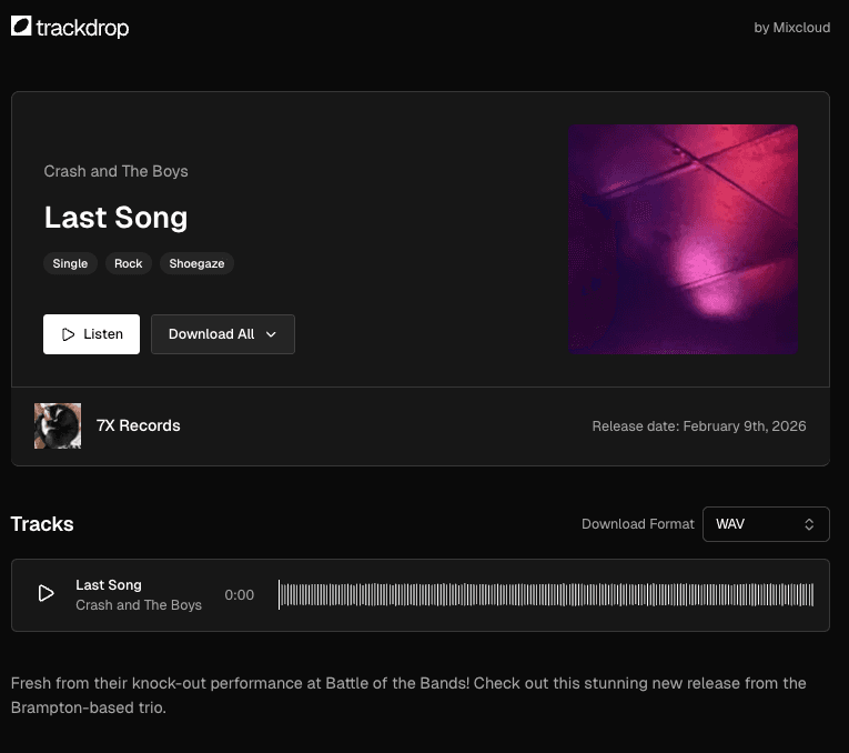 Each promo in Trackdrop is a self-contained release package: cover artwork, track metadata, audio files (with optional protected downloads), and a dedicated page exclusively for your contacts to visit to check out your latest release.