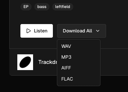 Look for the format selector at the top of the track list — it shows AIFF | WAV | MP3 | FLAC. Click your preferred format before downloading: